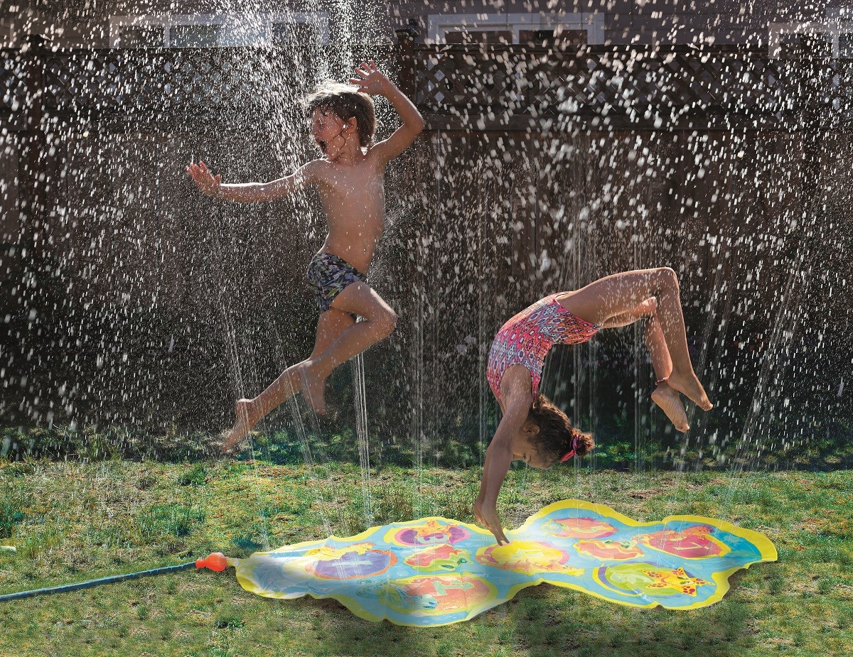 El juego de agua será perdfecto para divertir a lo mamás pequeños. Ponlo en el jardín o en una superficie plana, engancha la manguera y enciéndela... ¡saldrá agua por todos lados! Es divertido, seguro, fácil de instalar. Se pueden ajustar los chorros con la potencia de la manguera.