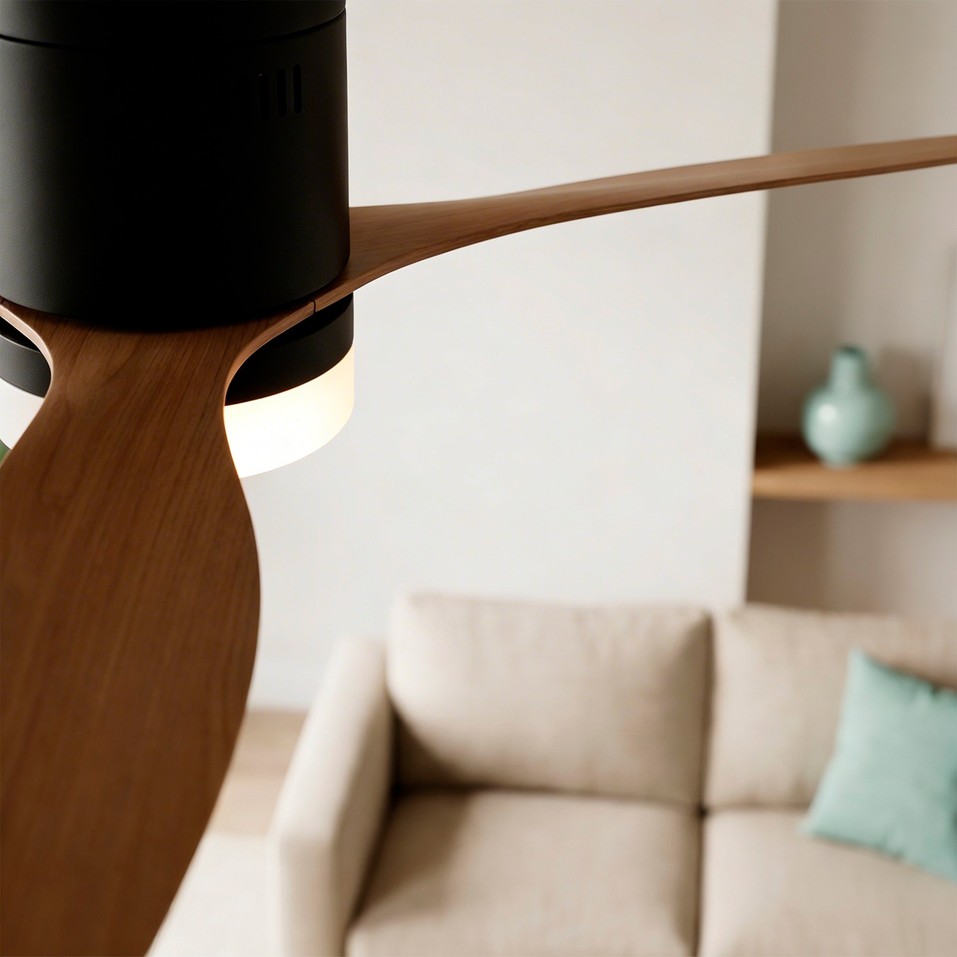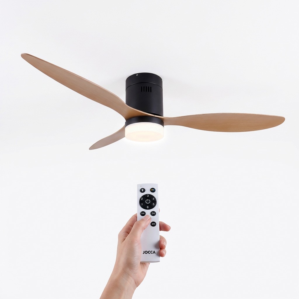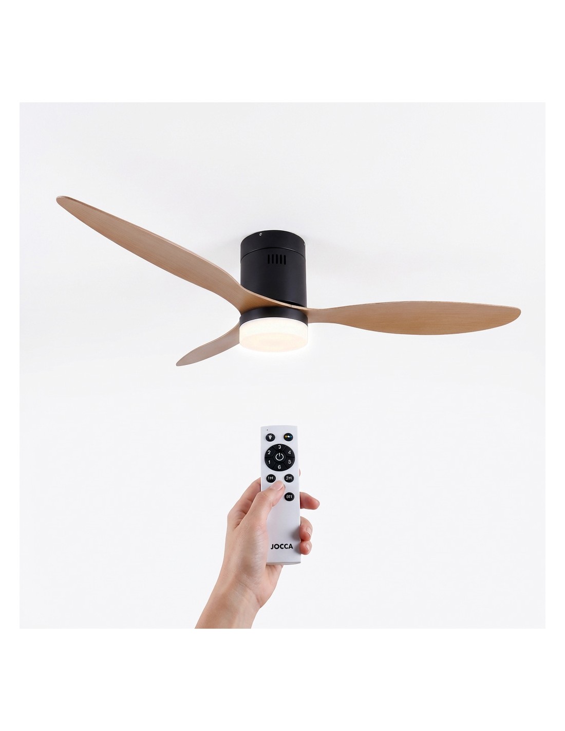 Ventilador de techo Jocca con motor DC silencioso, luz LED integrada y diseño minimalista para todo el año.