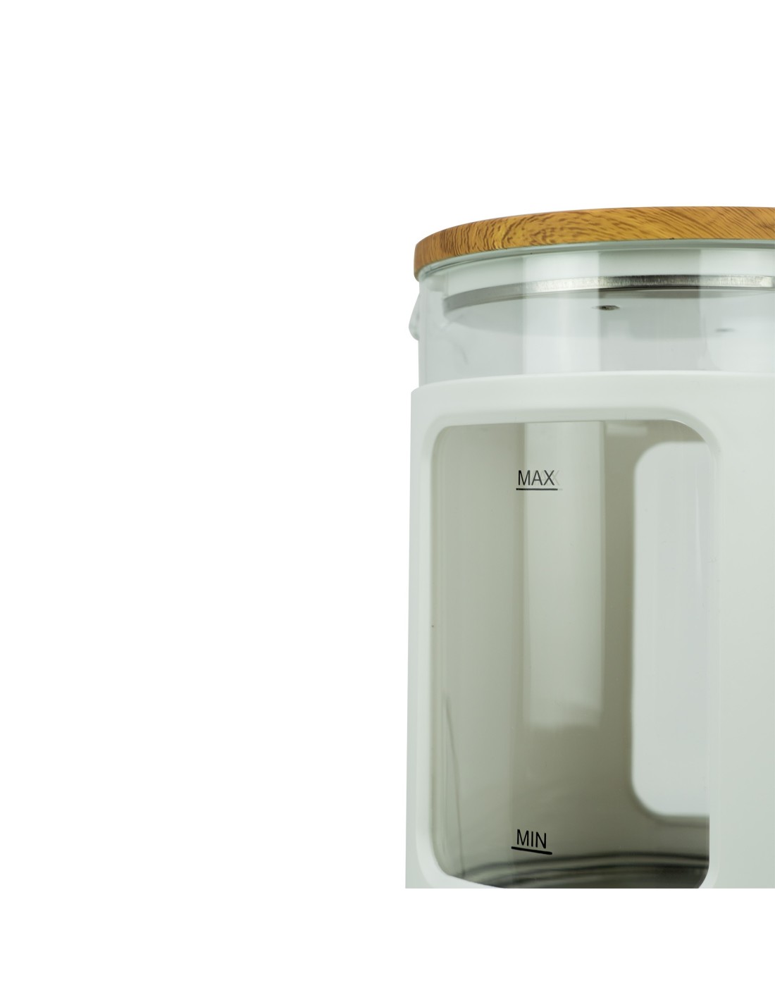 Materiales: vidrio borosilicato, acero inoxidable, PP y decoración efecto madera