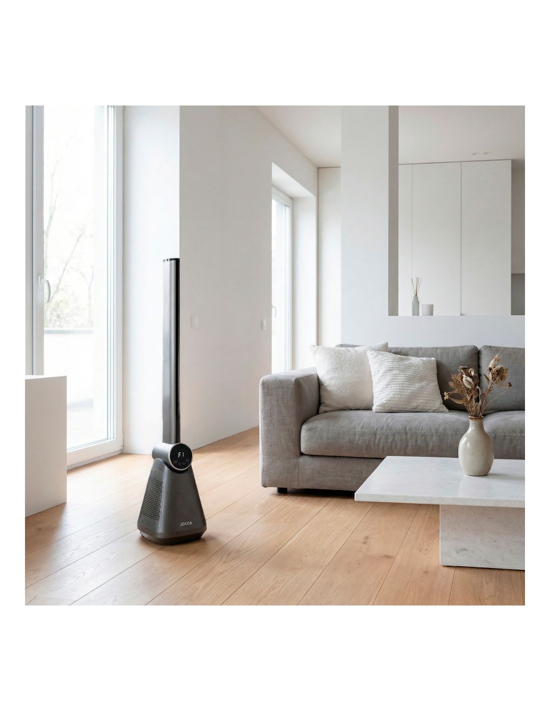 Este ventilador sin aspas destaca por su estética elegante y minimalista, con un diseño vertical que se adapta perfectamente a cualquier espacio del hogar, ya sea en el salón, dormitorio u oficina. Su estructura estilizada no solo aporta un toque moderno, sino que también optimiza el espacio, convirtiéndolo en una opción ideal para estancias donde se busca funcionalidad sin renunciar al diseño.
