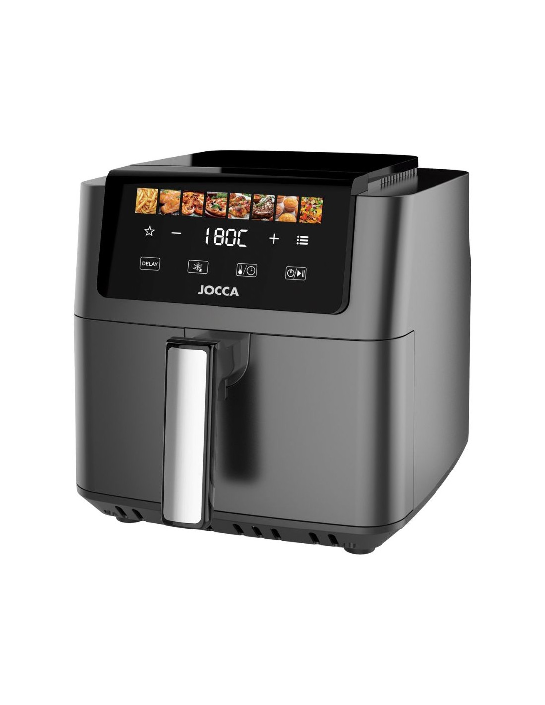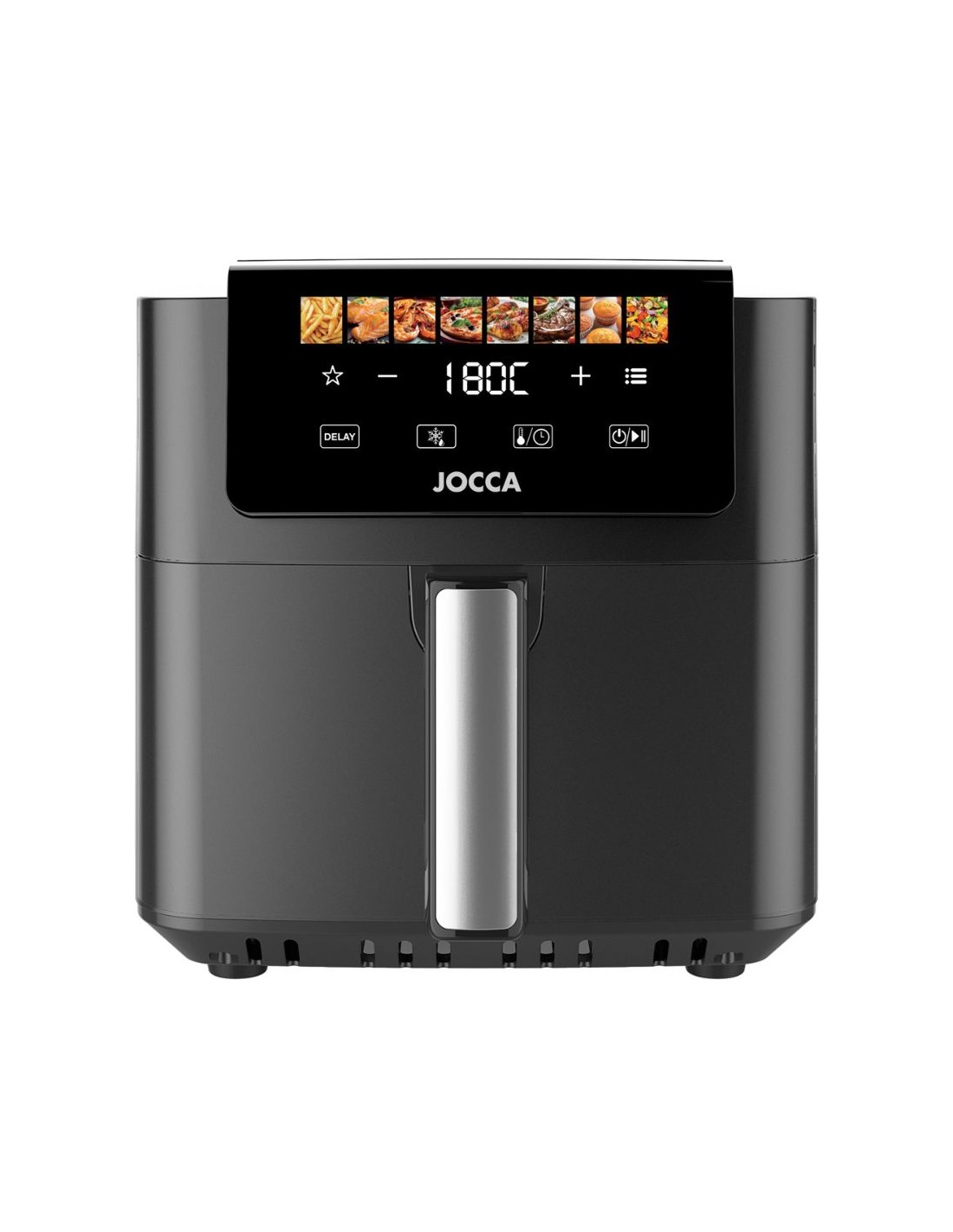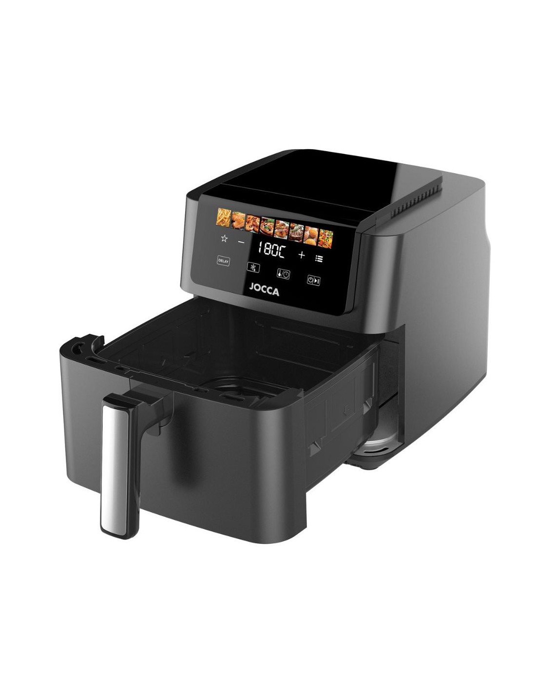 La freidora de aire Jocca está diseñada para ofrecer comodidad y durabilidad. Su cavidad metálica mejora la resistencia al uso continuado y garantiza una mejor distribución del calor. El cajón extraíble con mango desmontable facilita tanto el uso como la limpieza, permitiendo manipular los alimentos con seguridad y comodidad.