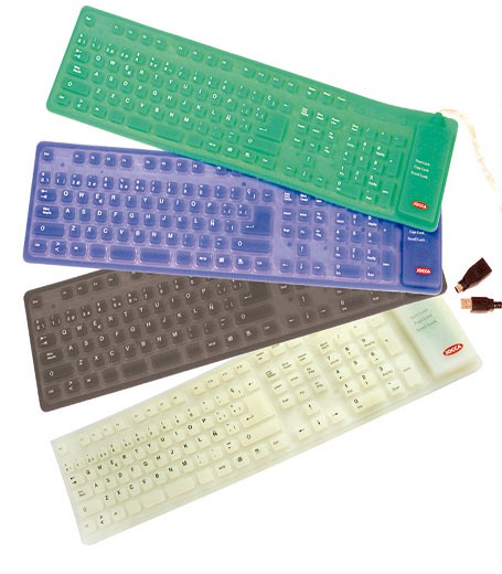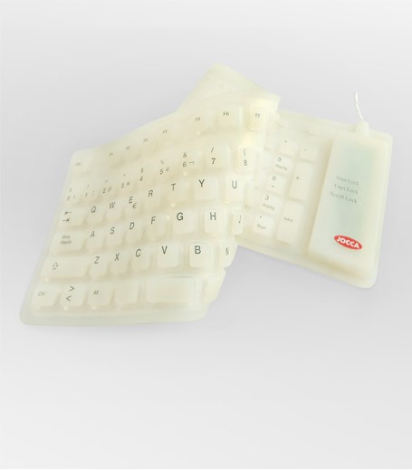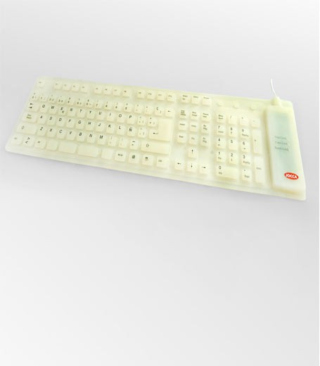 En JOCCA tenemos los teclados más atractivos del mercado. Estos teclados sirven tanto para ordenador y para tablet, y lo más llamativo es que son de colores: blanco, negro, verde y azul. Son teclados flexibles, es decir, que no te ocuparán prácticamente nada ya que los puedes doblar y son extraplanos, por lo que los podrás transportar donde quieras. Además, estos teclados flexibles son muy fáciles de limpiar, ya que son de silicona, no se te llenarán de polvo como los teclados convencionales. Al ser de este material tan maravilloso, además son resistentes al agua, y completamente silenciosos, ¡vamos, una maravilla!
