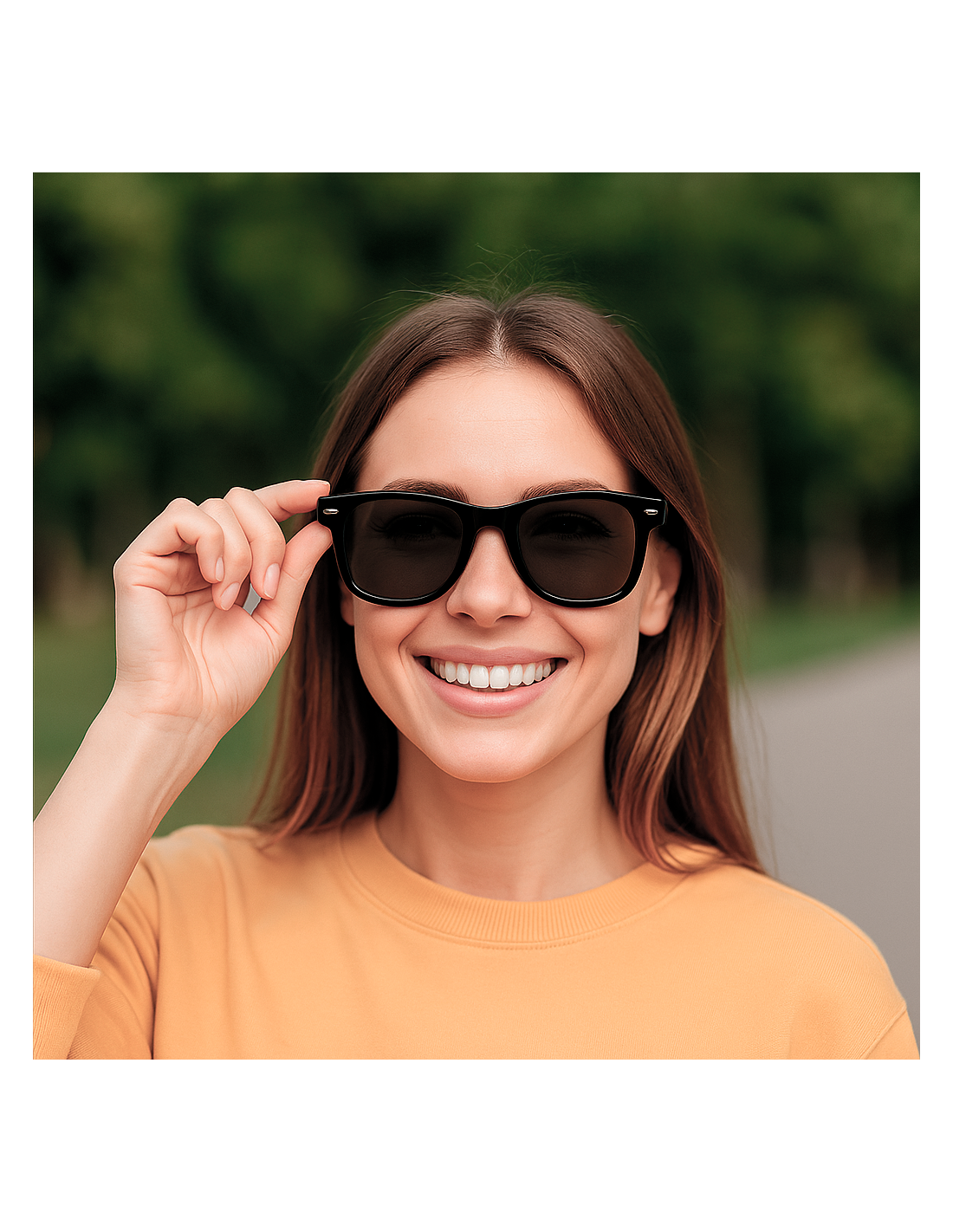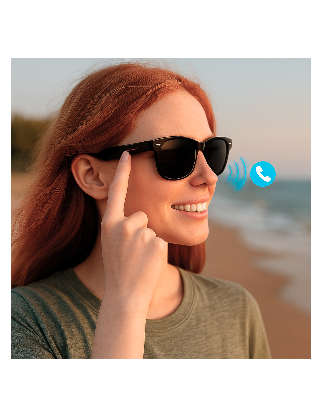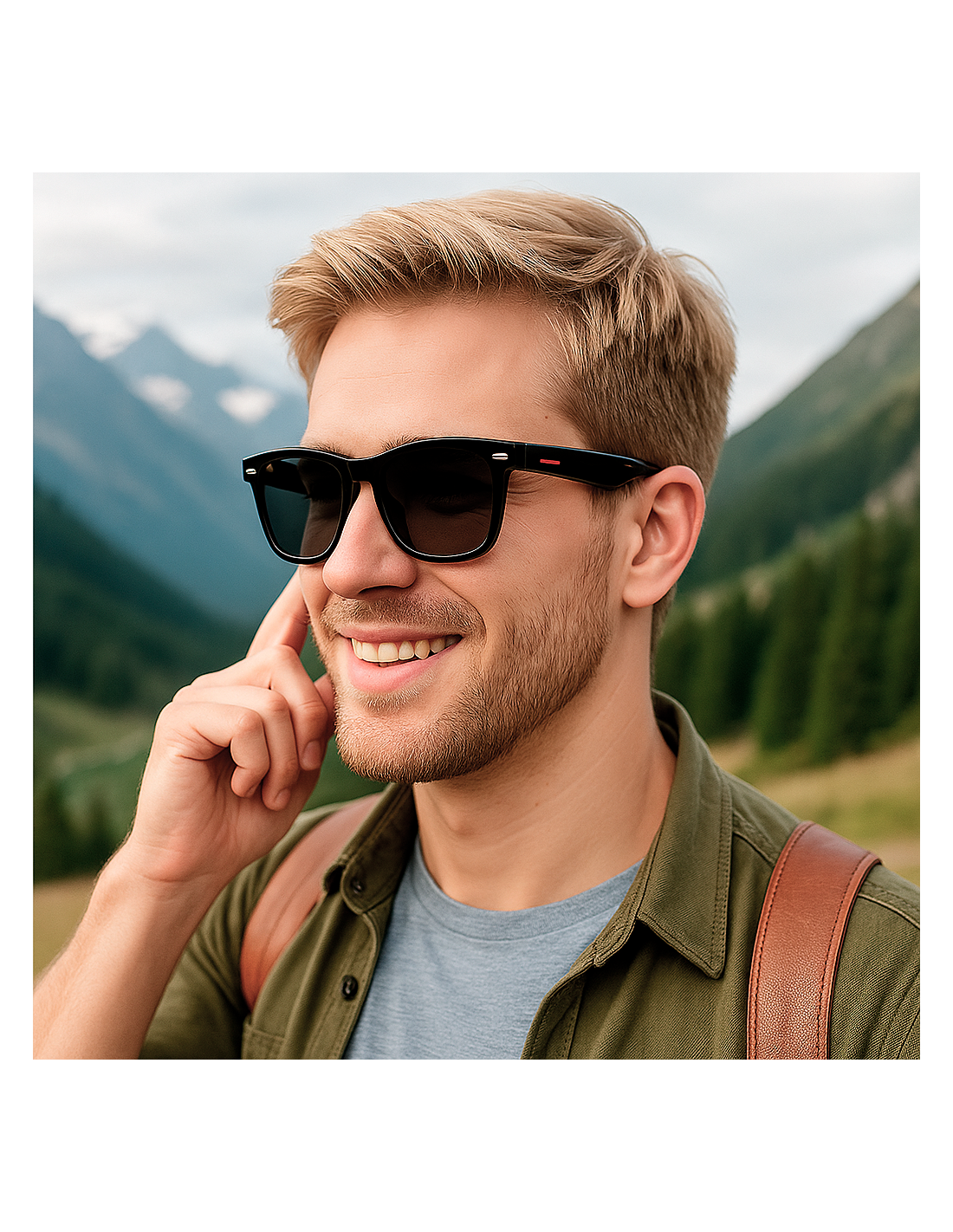 Intelligente solbriller med Bluetooth 5.3, polariserede UV400-objektiver og berøringskontrol på stifterne. Lyt til musik, svar kalder og nyder udendørs med stil, komfort og trådløs.