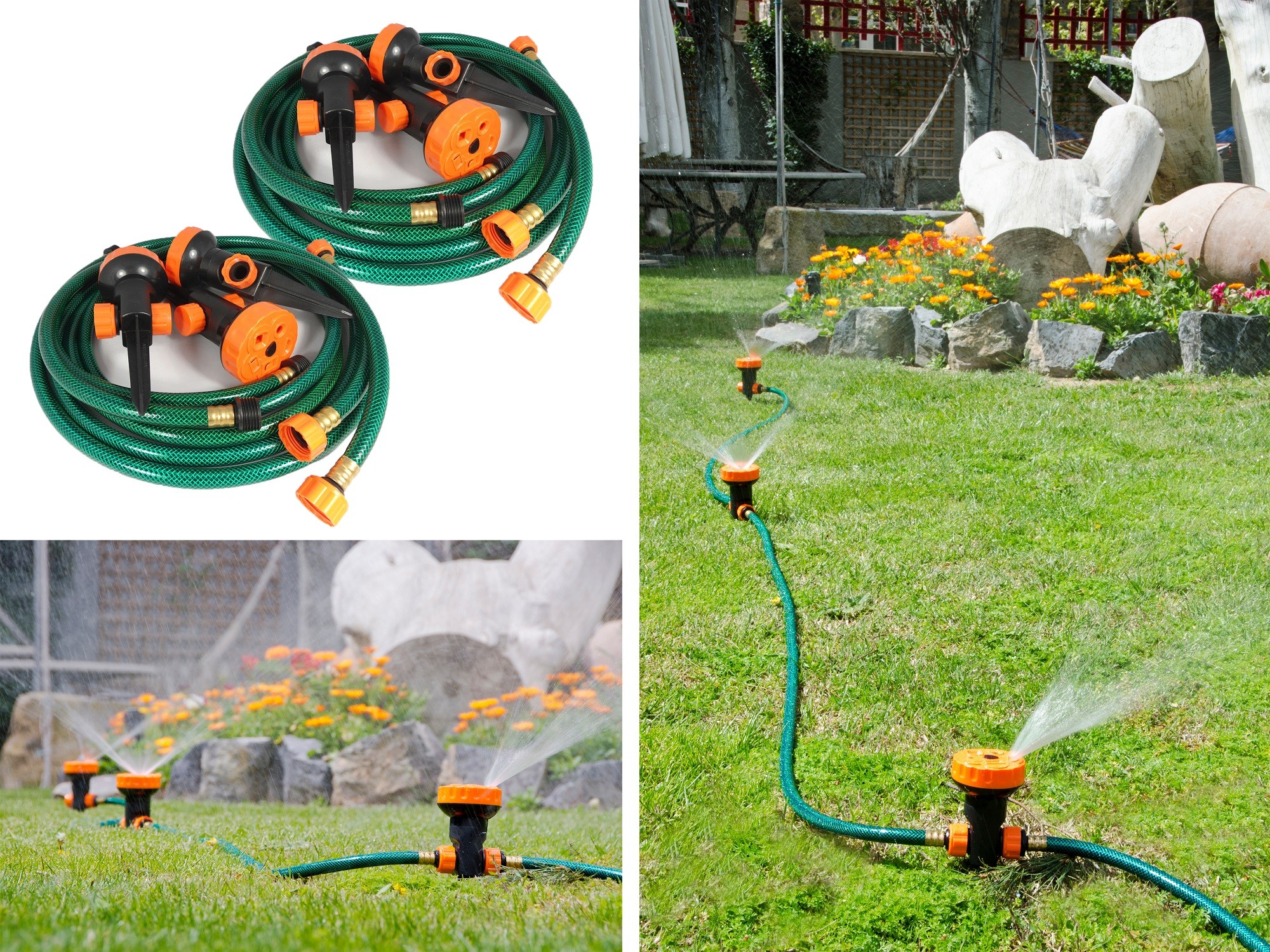 Die tragbares bewässerungssystem hat eine maximale reichweite von 60 quadratmetern. Es umfasst 6 Bestreuer von 21cm. x 7,5cm mit 5 verschiedenen diffusionsmodi. Und 6 180cm Kupplungsschläuche.