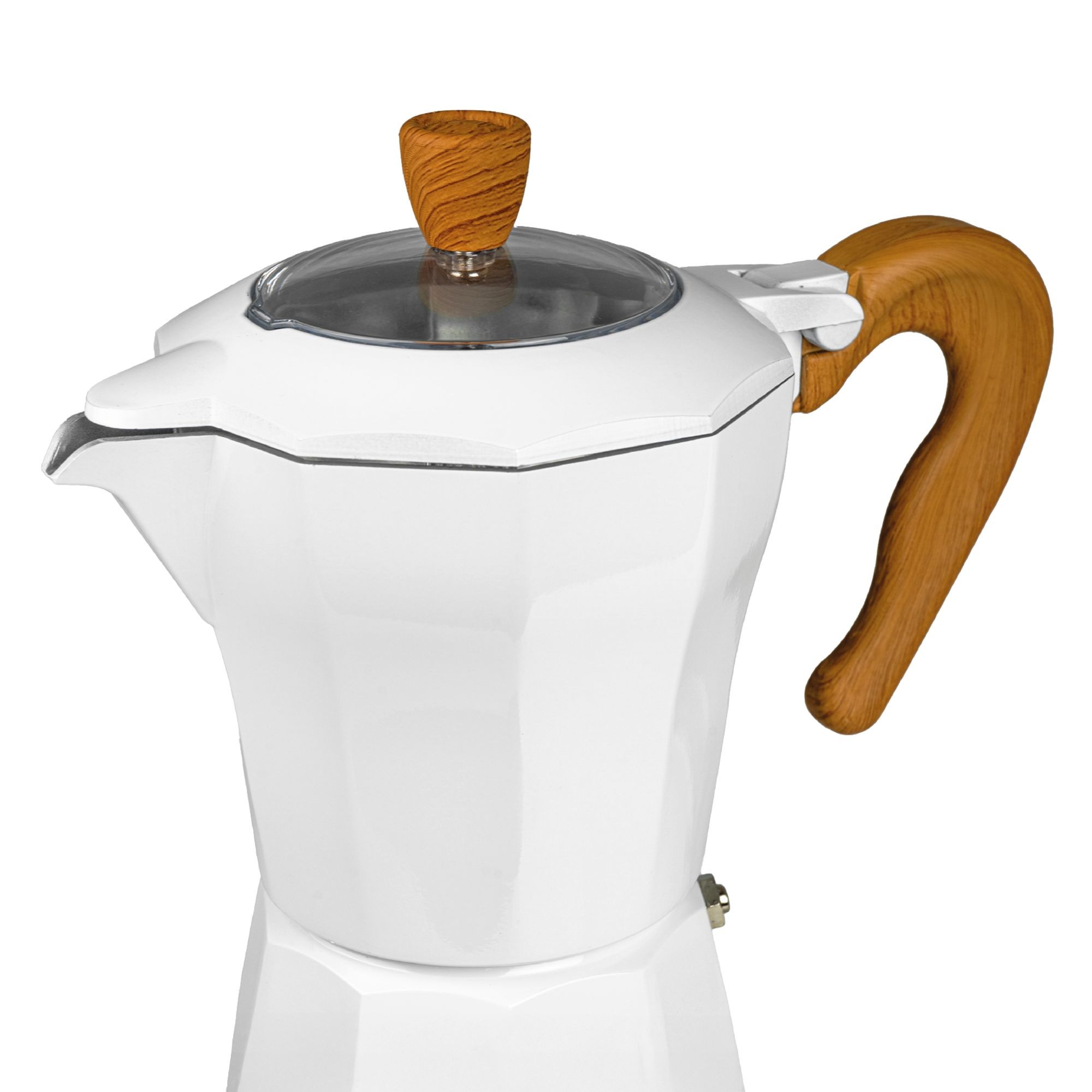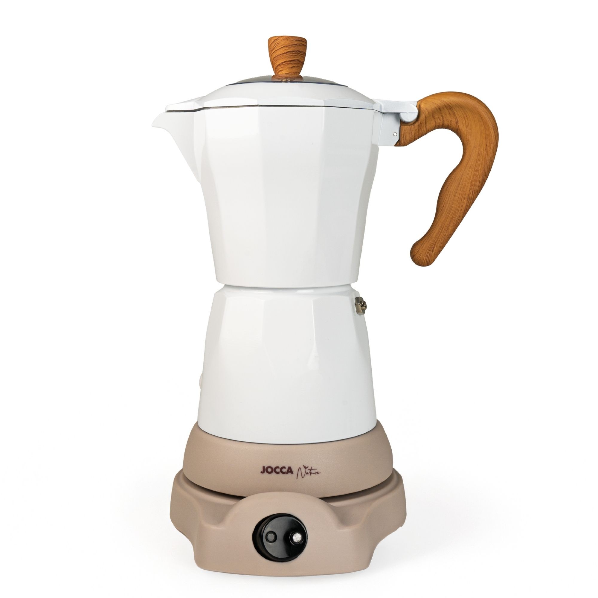 Elektrische italienische Kaffeemaschine Jocca Natur von 6 Tassen, elegantes Design auf weißem oder schwarzem und traditionellem Moka-Geschmack.