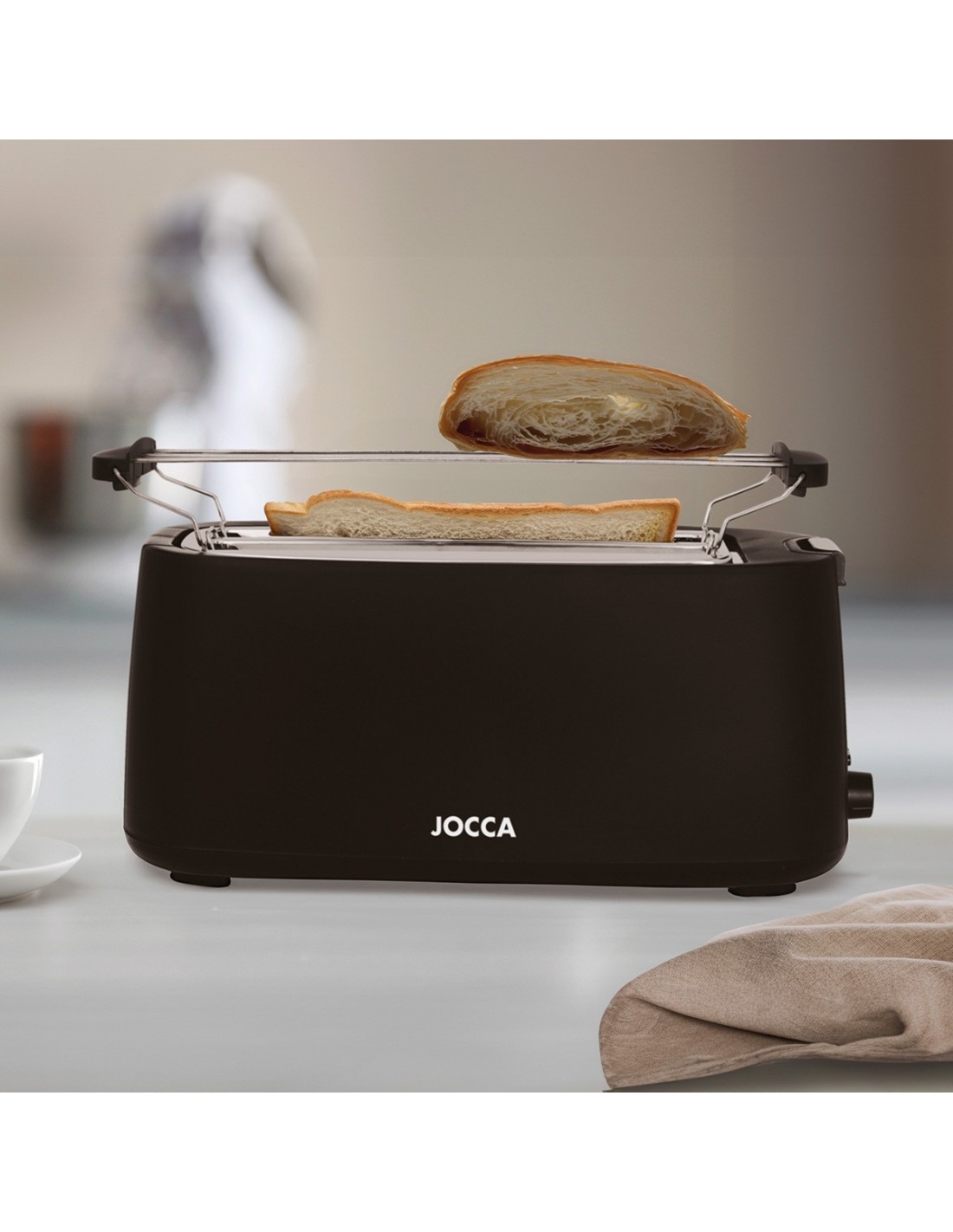 Avec une capacité de 4 toasts dans sa longue et large double fente, avec une grande polyvalence et espace ce grille-pain Jocca est parfait pour préparer les petits déjeuners ou collations de toute la famille rapidement et commodément. Il convient à différents types de pains, comme le pain maison. En outre, il a un système auto-centré pour obtenir un toast parfait sur chaque utilisation.
