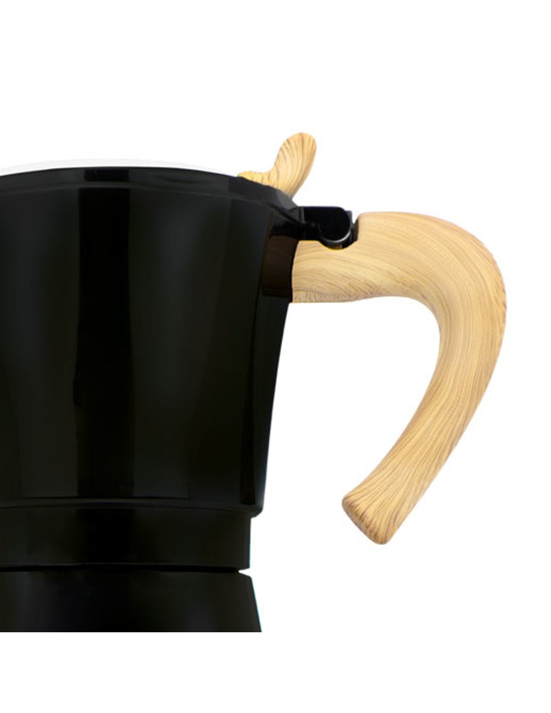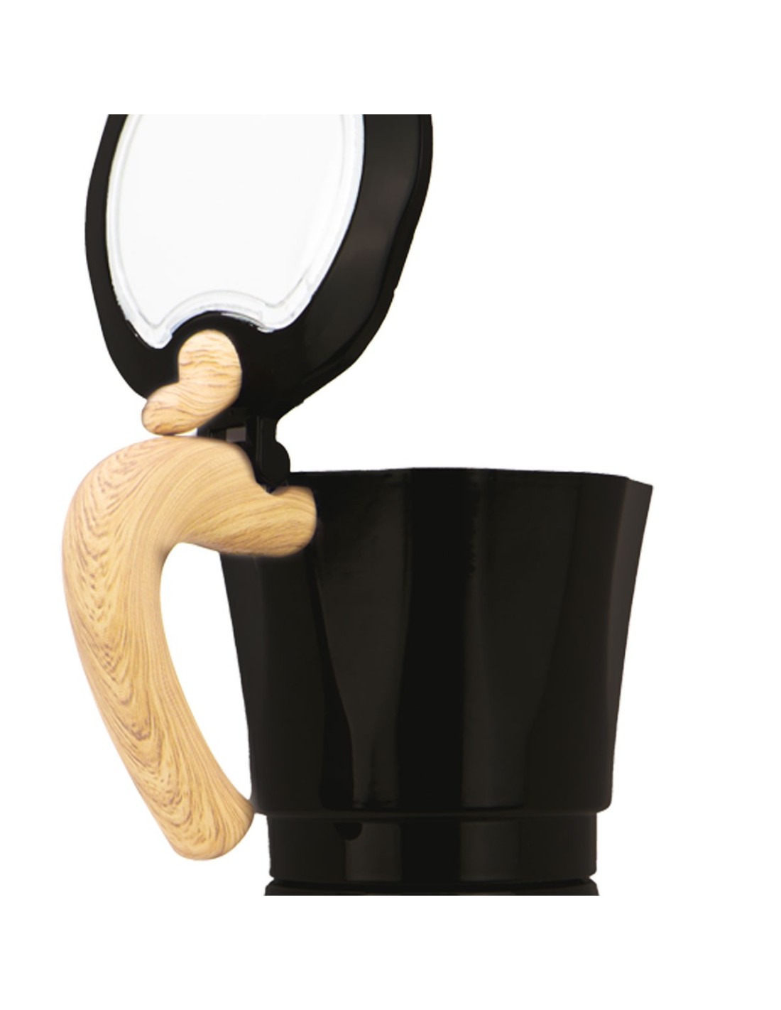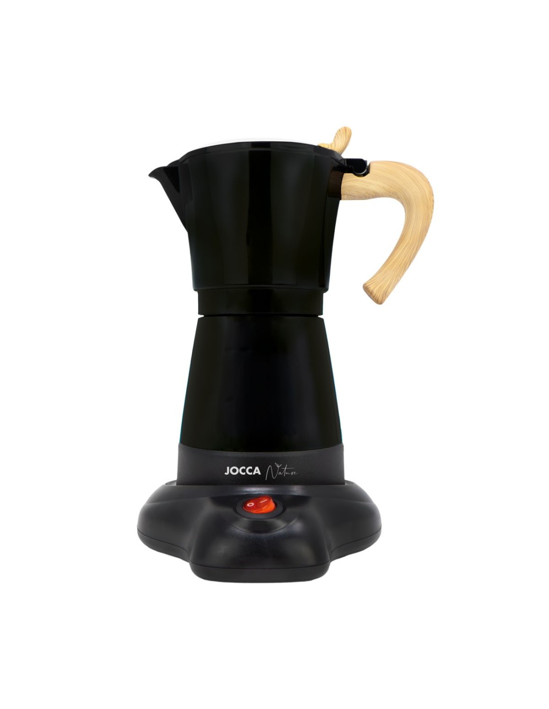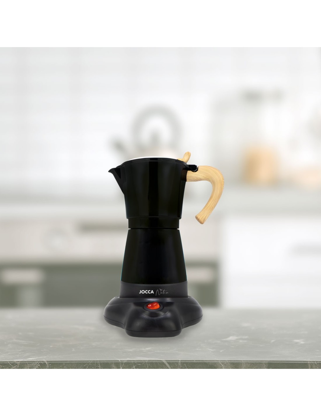 Machine à café électrique Jocca 6 tasses avec design élégant en aluminium et en bois, rapides et pratiques pour votre café quotidien.