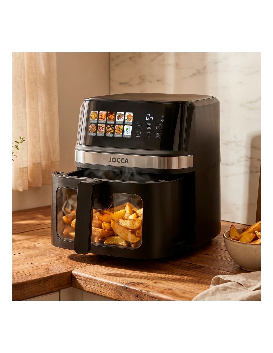 Découvrez la friteuse d'air 8L Jocca, Conçu pour ceux qui recherchent une capacité maximale, un pouvoir et des résultats professionnels à la maison. Grâce à ses 2200W et à son système de double résistance innovant, obtenez une cuisson plus rapide, uniforme et croquante, idéale pour toutes sortes de recettes sans avoir besoin d'huile.