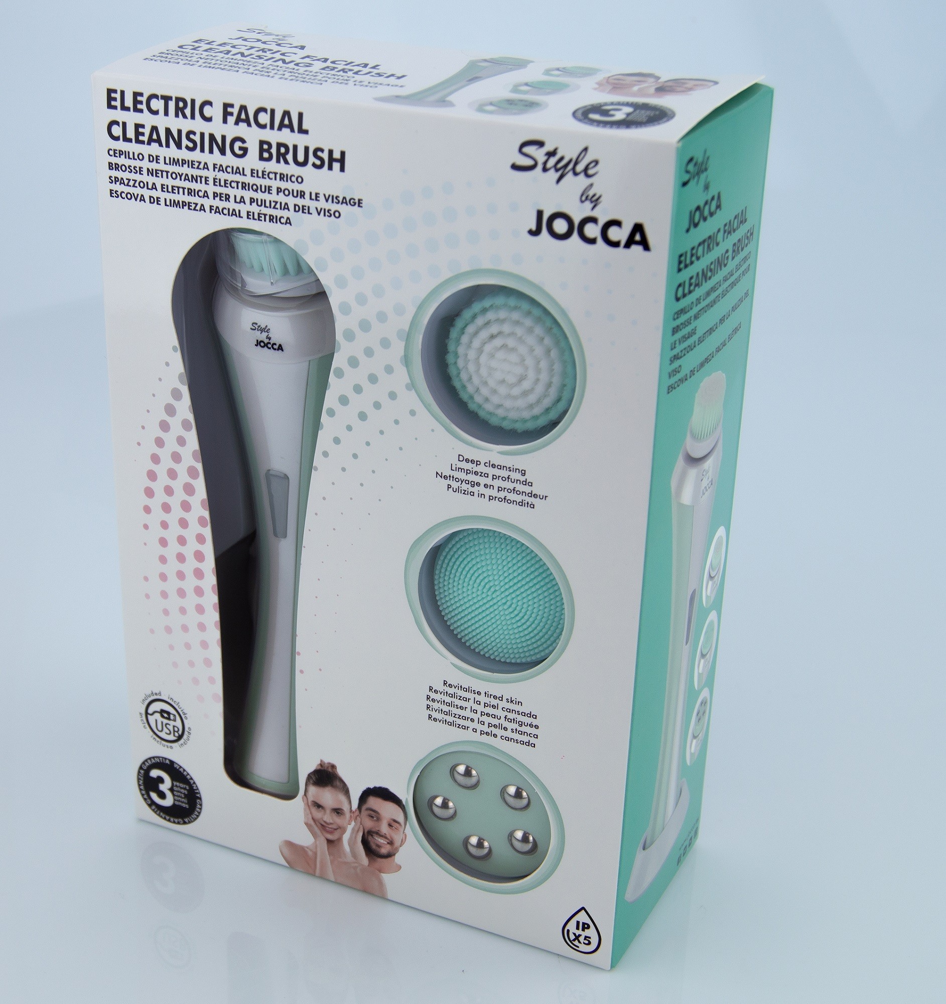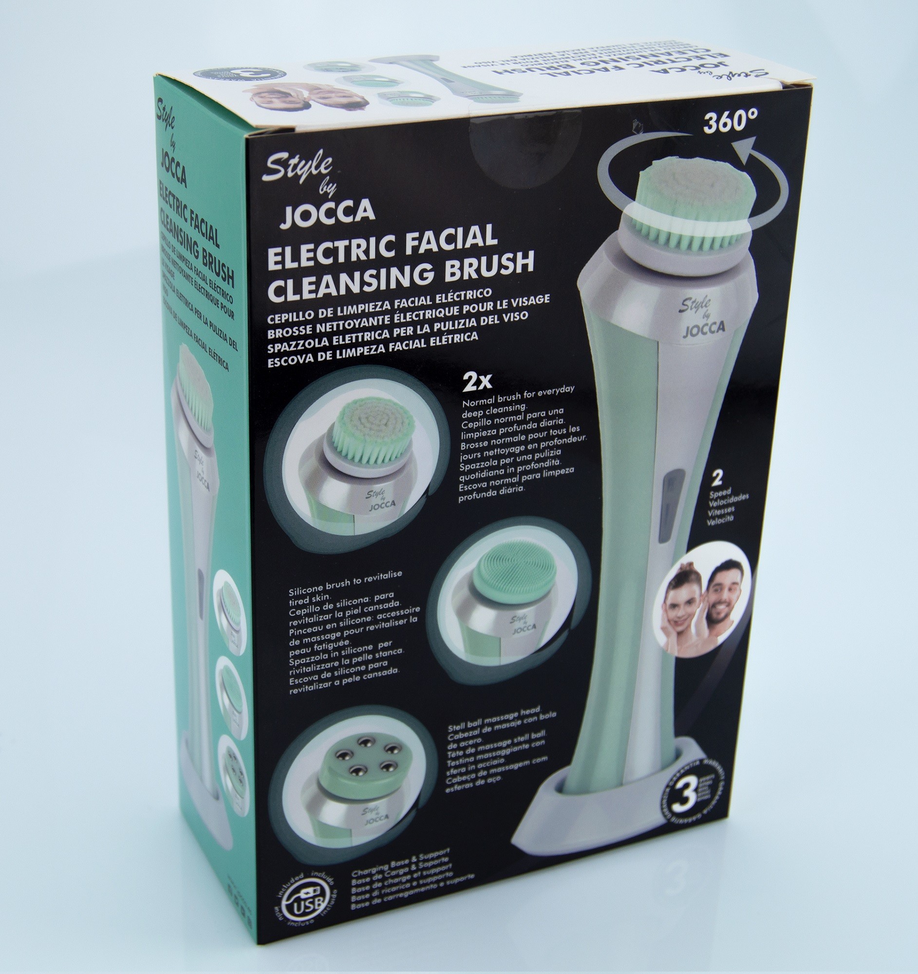 Account with two speed settings turn. Comes with a total of 3 skin care tools: 1 silicone head for all types of skins, 1 soft wax brush head and 1 massage head. The brush Jocca it is rechargeable and portable. Suitable for all types of skin.