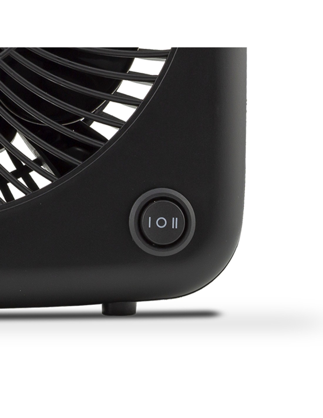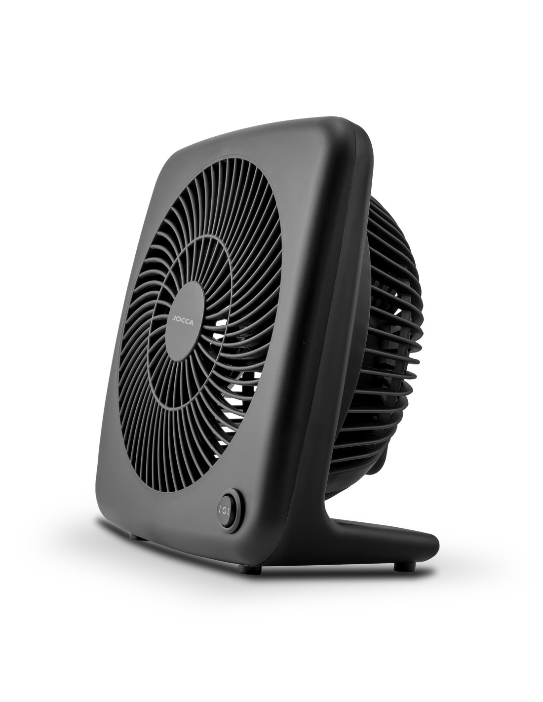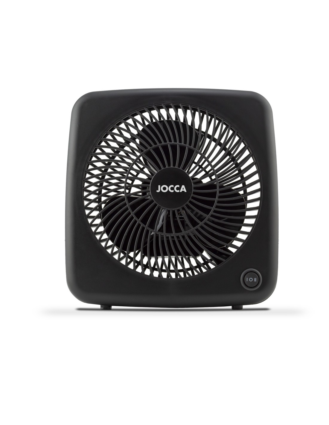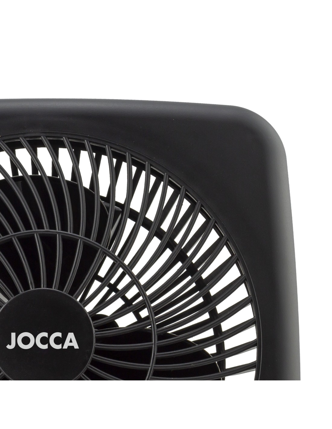 Ventilador de mesa Jocca de diseño compacto, elegante y original gracias a sus esquinas redondeadas y sus colores. Disponible en azul y negro. Su estructura es robusta, cuenta con asa para fácil transporte y pies antideslizantes para plena seguridad. Cuenta con 2 velocidades y 30W de potencia.