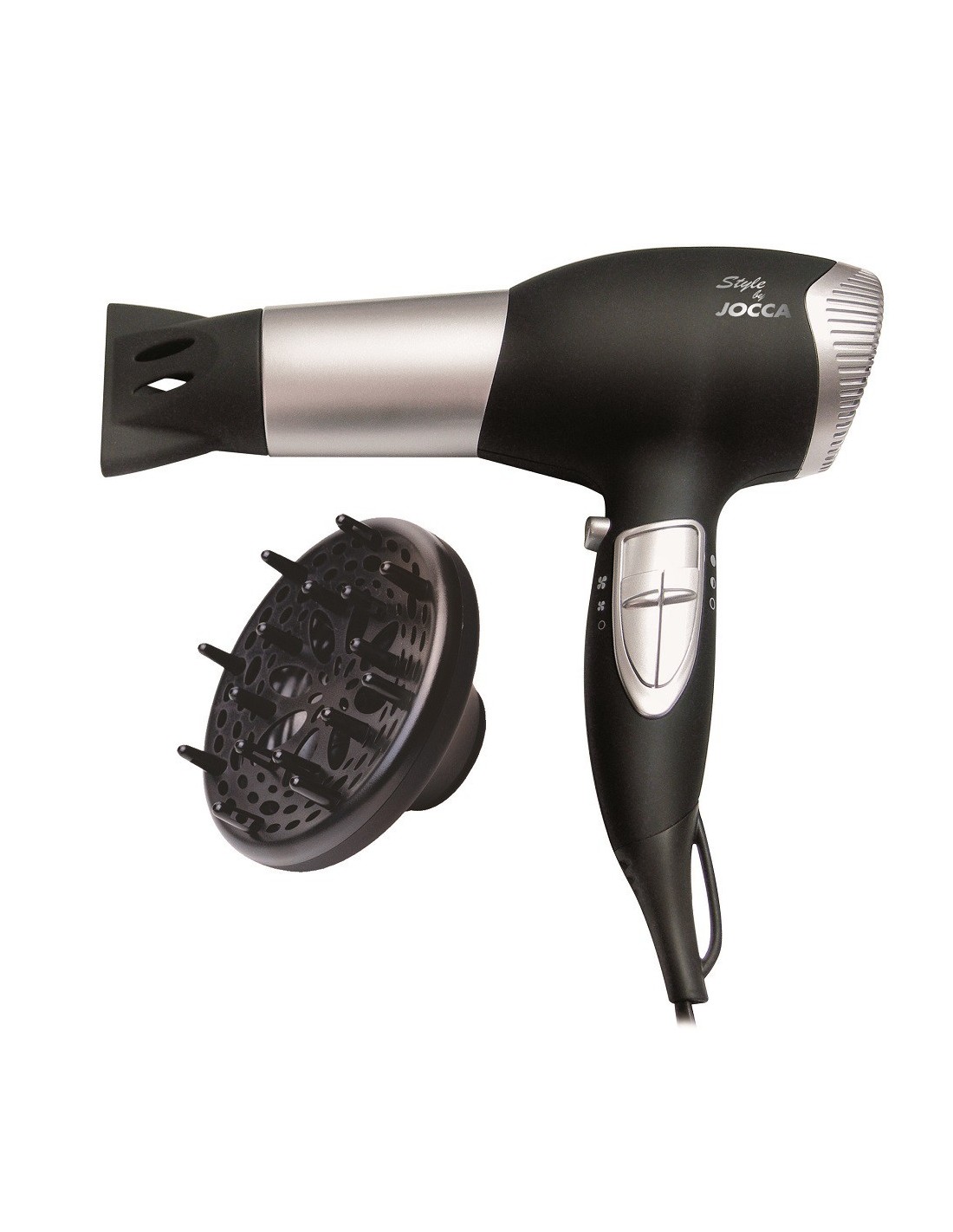Kapjon egy fodrász hajatCsendes, elegáns és erőteljes kézi szárítóJocca. Alkalmas sima, hullámos vagy göndör hajra.