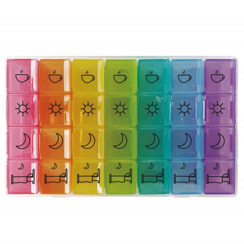 Takk til patent Jocca Det er ikke lenger en unnskyldning for å ta medisiner på hvert måltid, da du kan dele pillene i henhold til øyeblikket dagen. Har 4 rom For piller: frokost, mat, middag og før søvn.