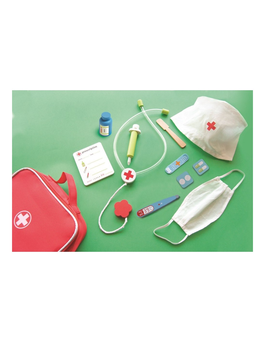 Doktor: koffert, maske, cofia, stetoskop, termometer, sirup båt, sprøyte, silke, piller x 2