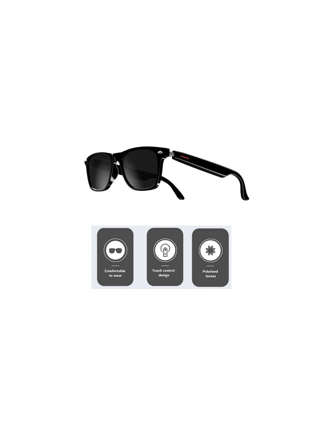 Intelligente solbriller med Bluetooth 5.3, polariserte UV400-objektiver og berøringskontroll på tappene. Lytt til musikk, svar på kall og nyter utendørs med stil, komfort og trådløs.