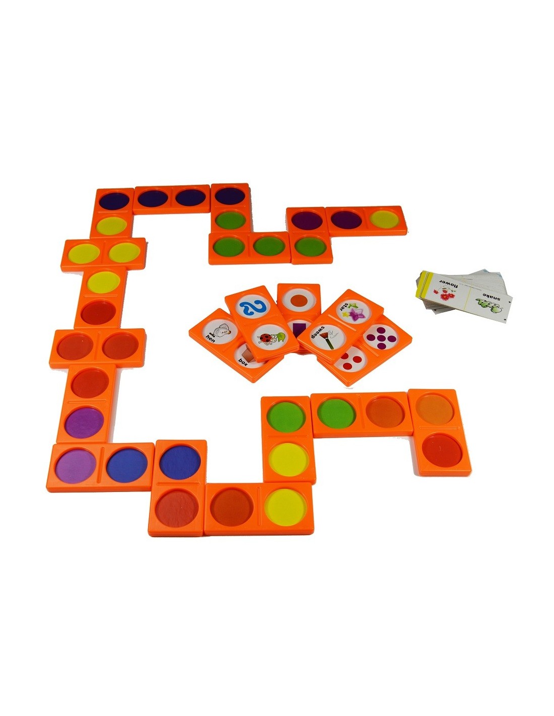 - Cada unidade inclui: 21 peças de plástico, 62 cartas de dominó para rosto duplo, para jogos diferentes para jogar com cores, formas, números e objetos