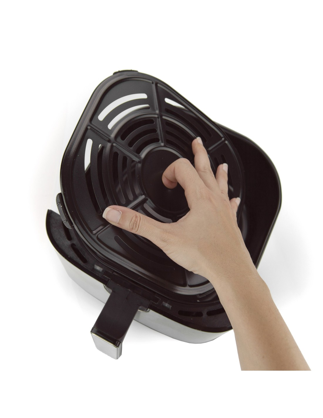 É muito fácil de usar porque tem um punho de toque frio, o que o torna duplo seguro porque também tem a proteção de superaquecimento. Também é muito fácil de limpar, apenas removendo a gaveta e limpando o recipiente, com a grade removível.