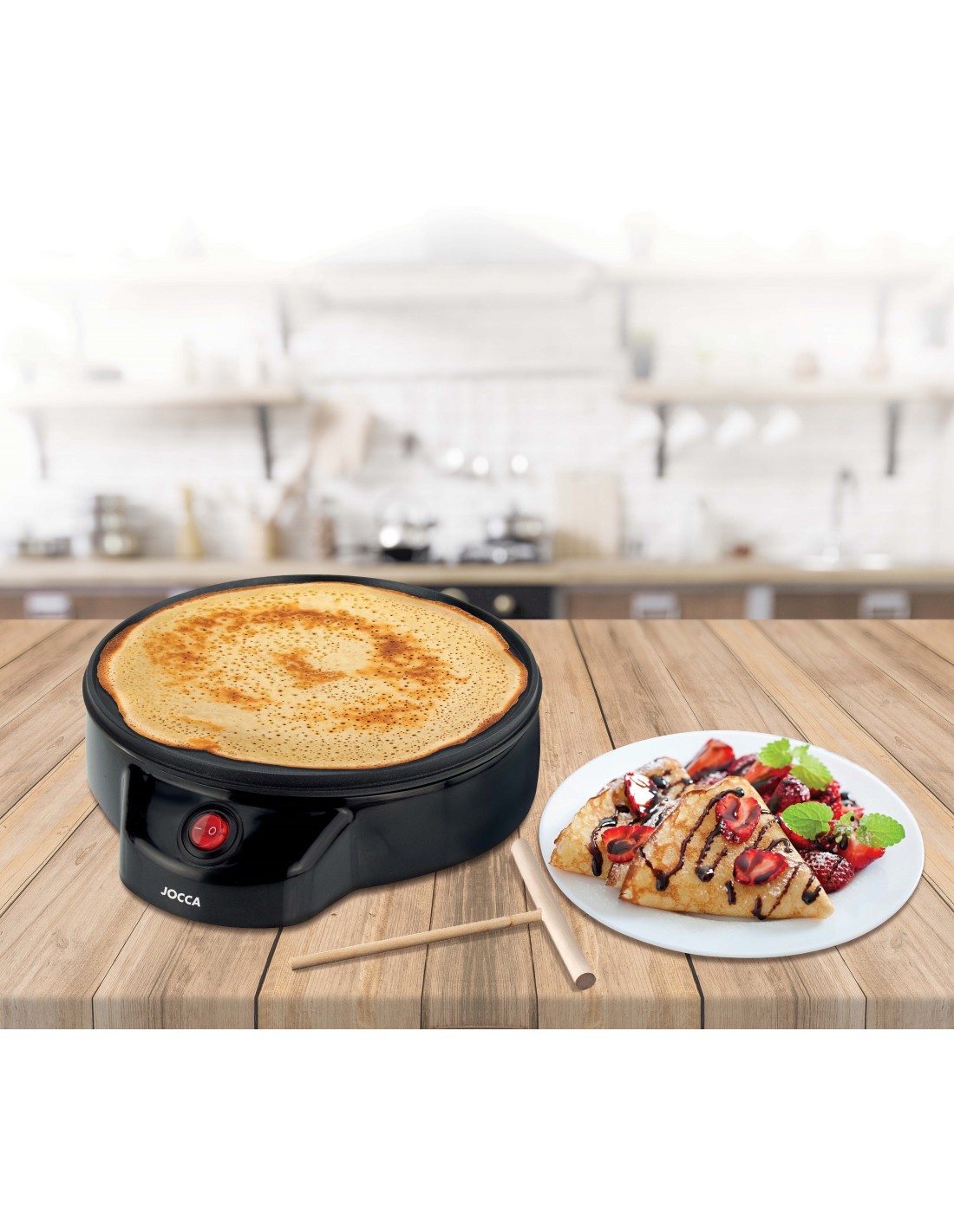 La crepera elétrica da marca Jocca com 700 Poder, tem um superfície antiaderente que permite criar os crepes perfeitos cada vez e facilita a limpeza.