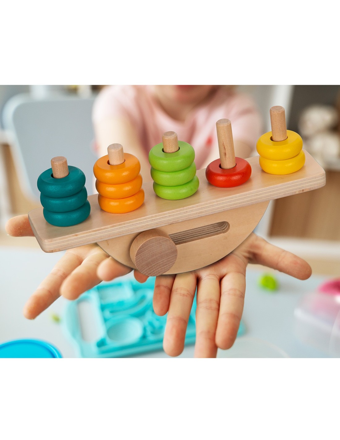 A Jocca empilhável abacus balancim É um brinquedo educacional de madeira projetado para estimular o desenvolvimento infantil de uma maneira divertida e segura. Ideal para crianças de 12 meses, este jogo empilhável de 3 níveis e 5 colunas Baseado em uma forma de balancim desafia os pequenos para equilibrar corretamente as peças para manter a estrutura estável.