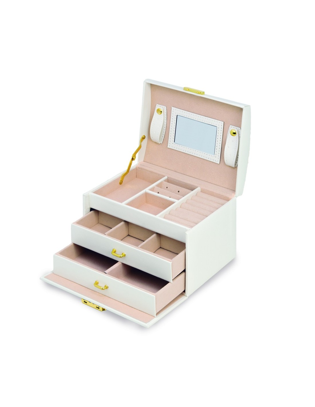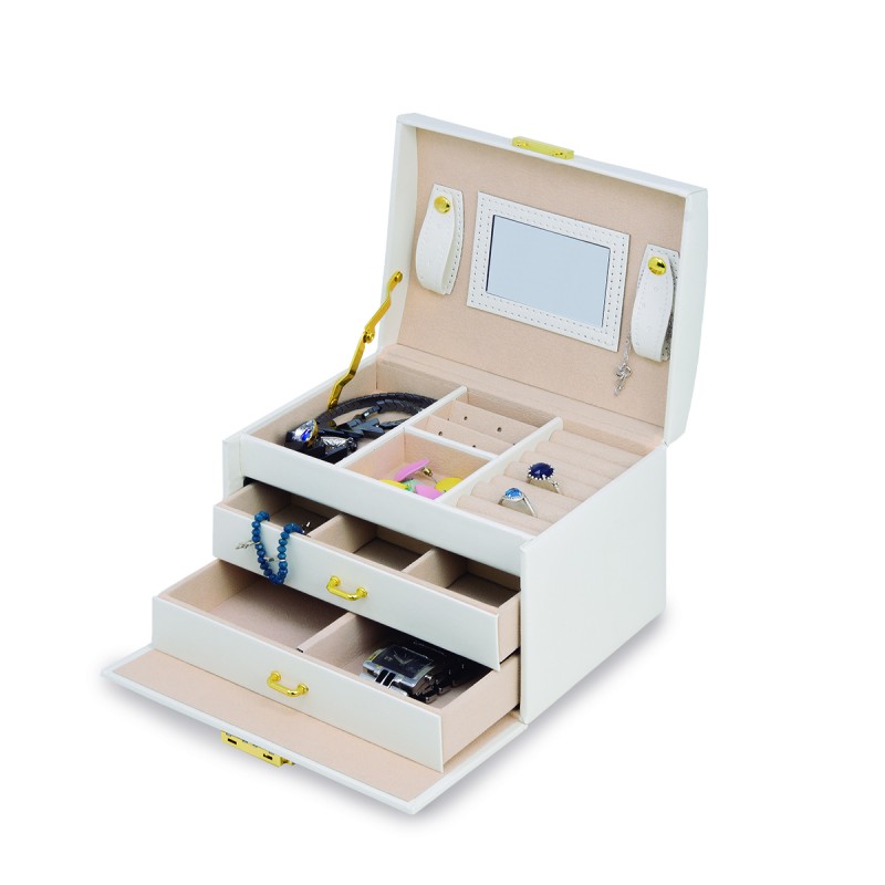 Graças à sua distribuição prática, a caixa de jóias oferece várias possibilidades de armazenamento para anéis, pulseiras, correntes e muito mais.
