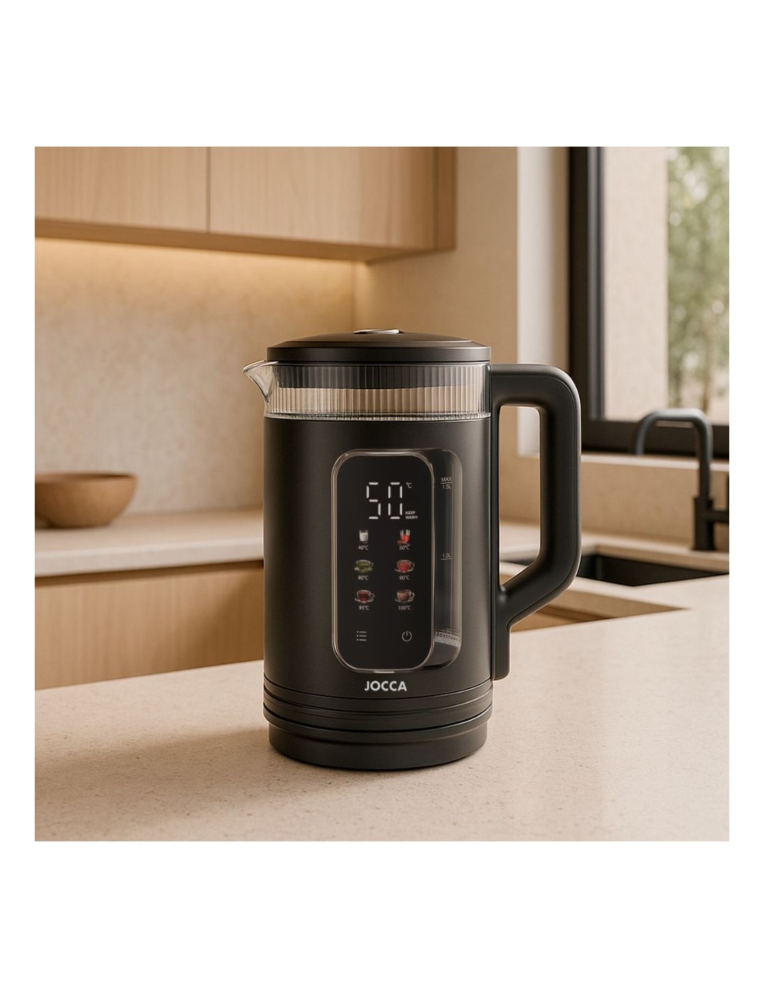 0 Ceainic electric Easy Touch 1.5L Jocca combină Tehnologie modernă, design elegant și securitate maximă Deci vă bucurați instantaneu apă caldă. Ta Color touch screen facilitează manipularea intuitivă și a acesteia LED lumină RGB Aceasta aduce o atingere decorativă care se schimbă în funcție de starea apei.