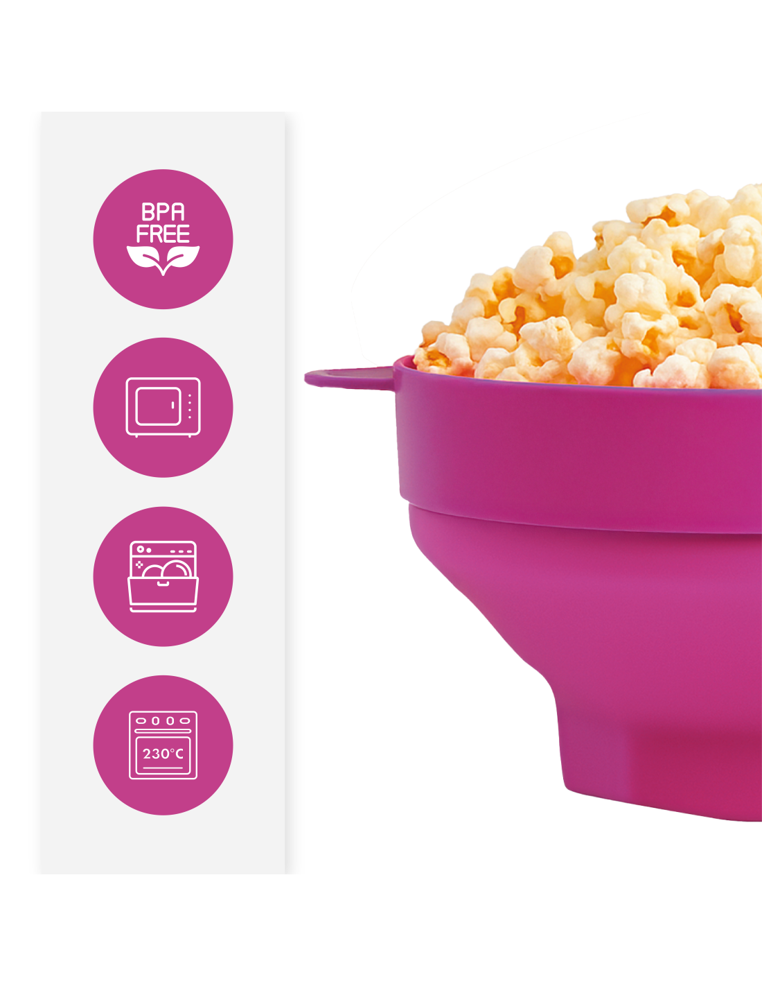 Fabricate în BPA Silicon alimentar gratuit, acest container garantează Rezistența, siguranța și ușurința utilizării. Cu un diametru de 18,5 cm și o înălțime de 12,5 cm, are capacitatea perfectă de a pregăti o parte generoasă de popcorn pentru a împărtăși.