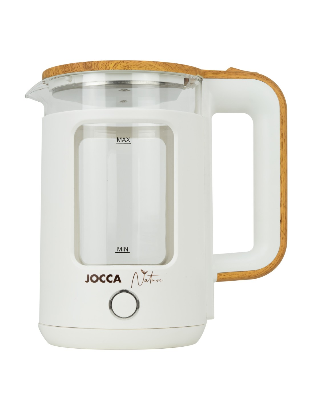 Električni kotliček Jocca Narava 1.8l, hitra, varna in s sodobno obliko v steklu in lesu.